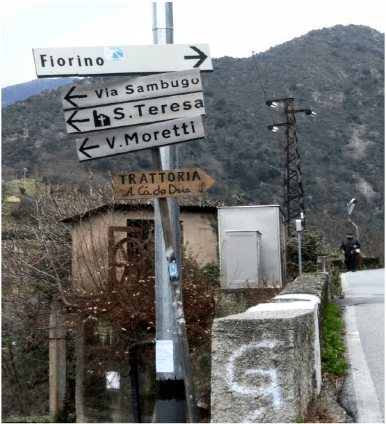 Ormai vicini al nucleo abitato, si incrociano tratti asfaltati e alcune stradine interpoderali che conducono a recenti nuovi edifici abitativi. Ora il percorso sale decisamente, fino a sbucare nel piano, trovandosi a fianco di via Osvaldo Moretti che proviene da Fabbriche con un tortuoso e ardito percorso, sostitutivo dell’incompiuta via Sambuco che si è appena percorsa. Qui, sul lato a valle, è da osservare il possente traliccio a portale in acciaio che sosteneva i cavi portanti della teleferica con stazione inferiore, ancora oggi visibile, sulla strada Fabbriche – Fiorino, presso la fermata AMT.