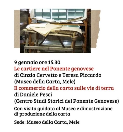 Carissimi amici del Centro Studi Storici, con questo piccolo promemoria vi ricordiamo che questo giovedì si terranno al Museo della Carta di Mele gli interventi di Cinzia Cervetto, Teresa Piccardo e Daniele Pesci incentrati sul mondo della carta in età medioevale. L’evento avrà inizio alle 15.30; al termine della conferenza sarà prevista una vista guidata al museo e una dimostrazione sulla produzione della carta.